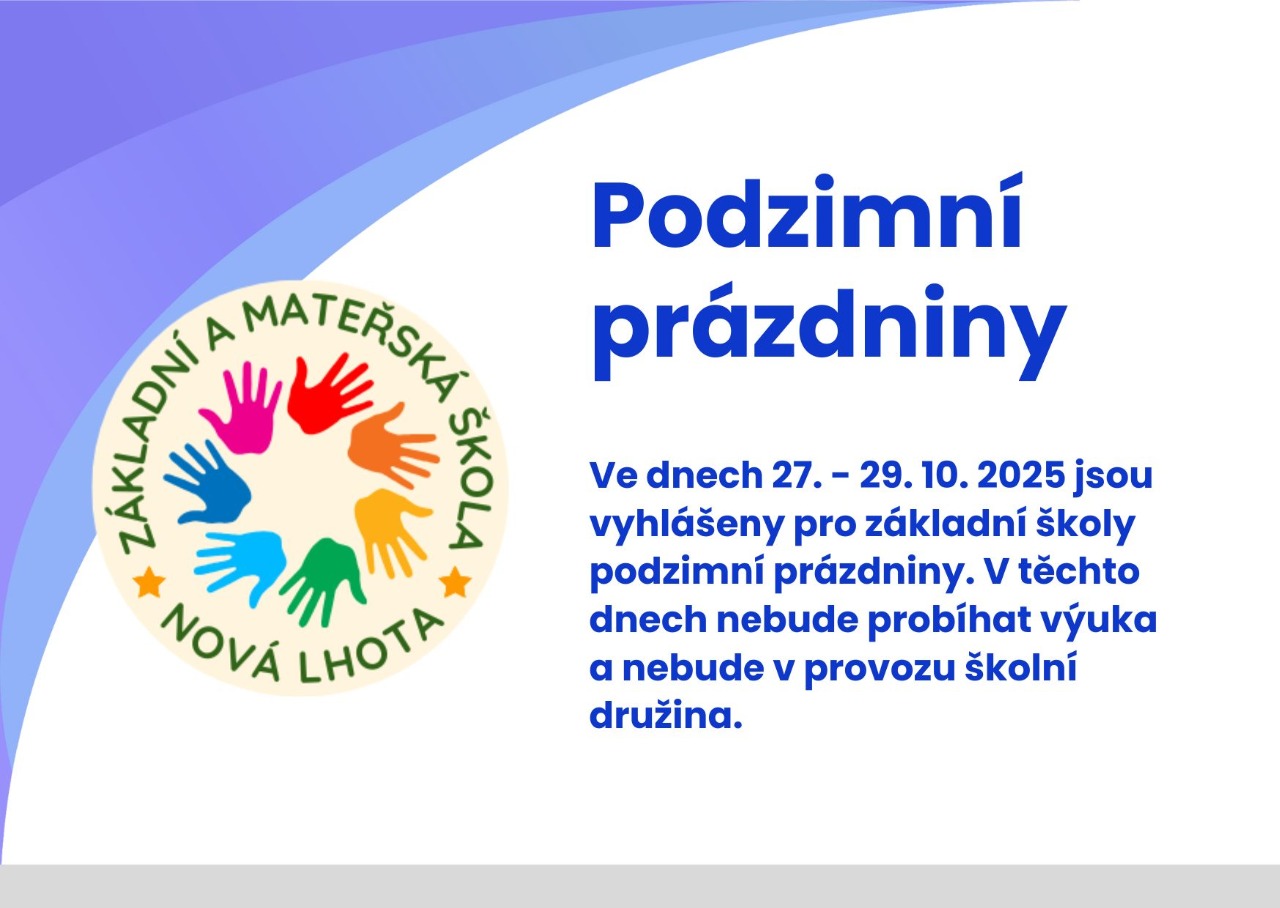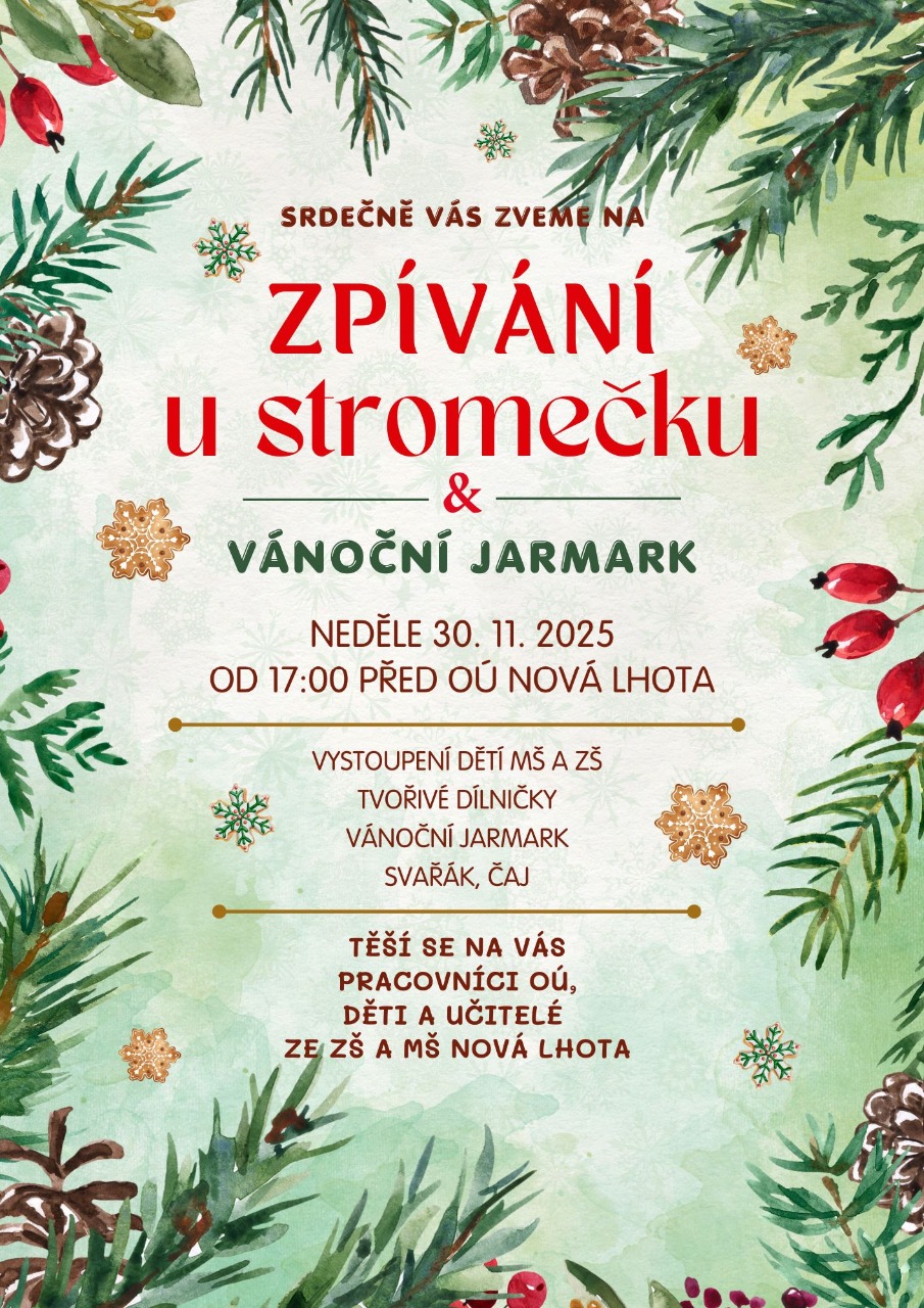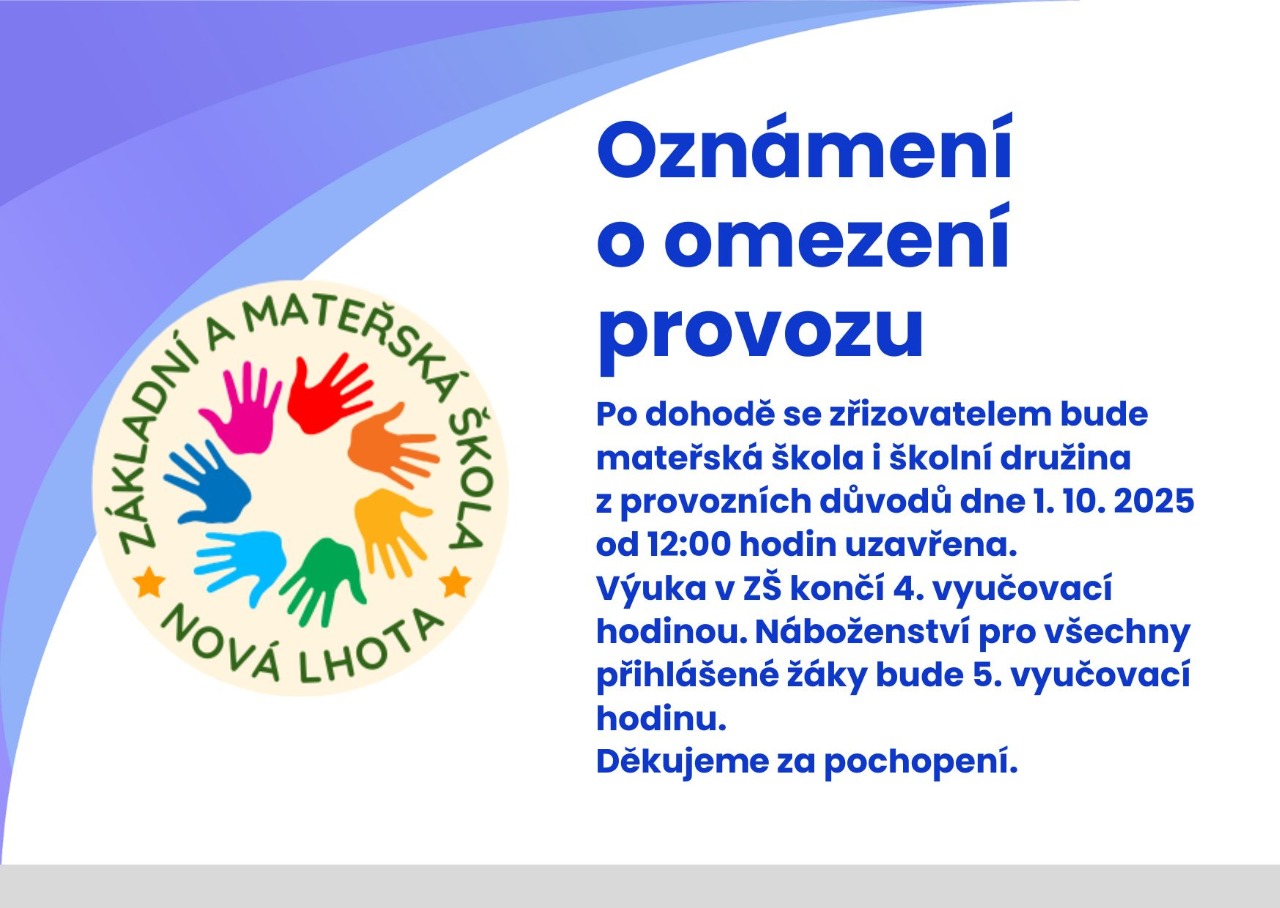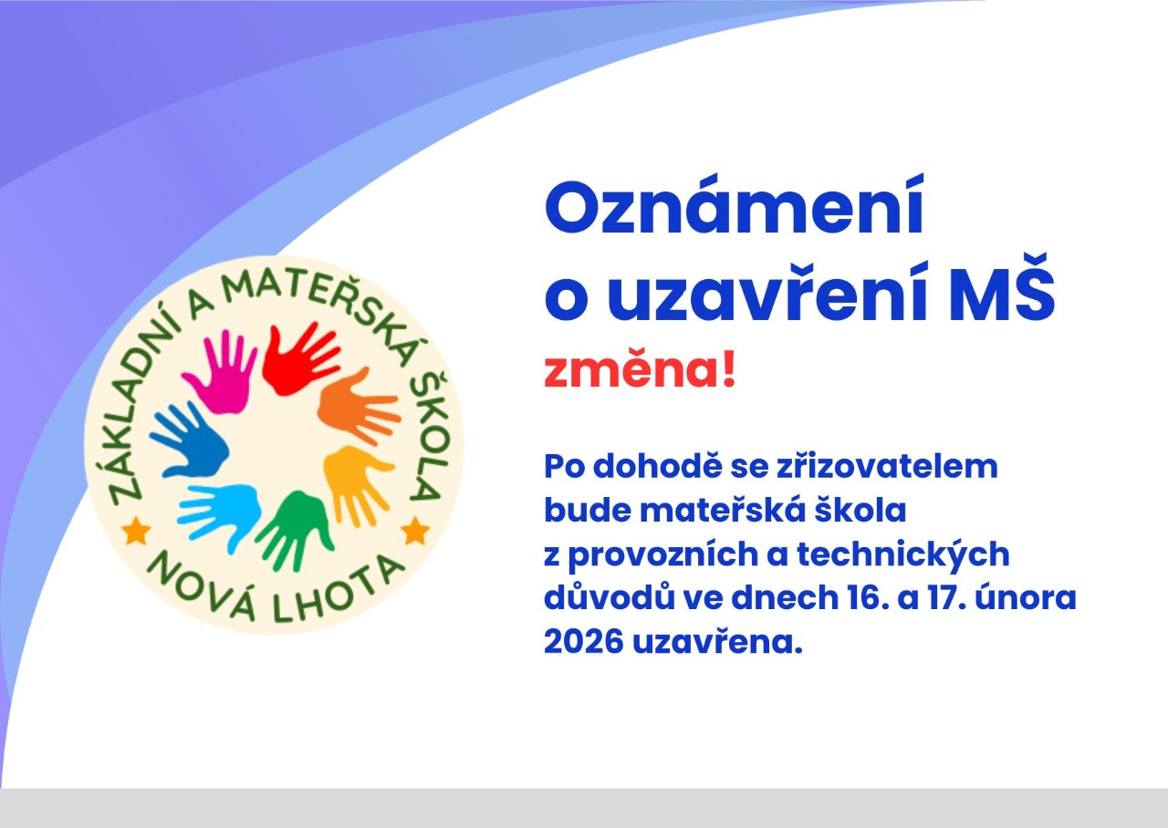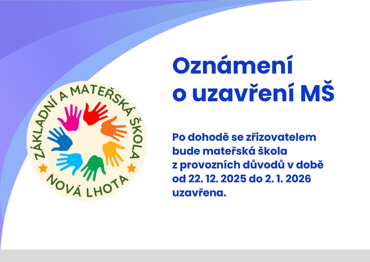 ředitelka Základní školy a mateřské školy Nová Lhota po dohodě se zřizovatelem oznamuje, že mateřská škola bude po dobu vánočních prázdnin, tj. od 23. 12. 2024 do 3. 1. 2025 uzavřena. Provoz bude obnoven 6. 1. 2025.