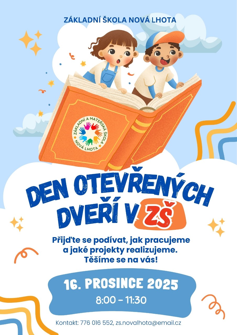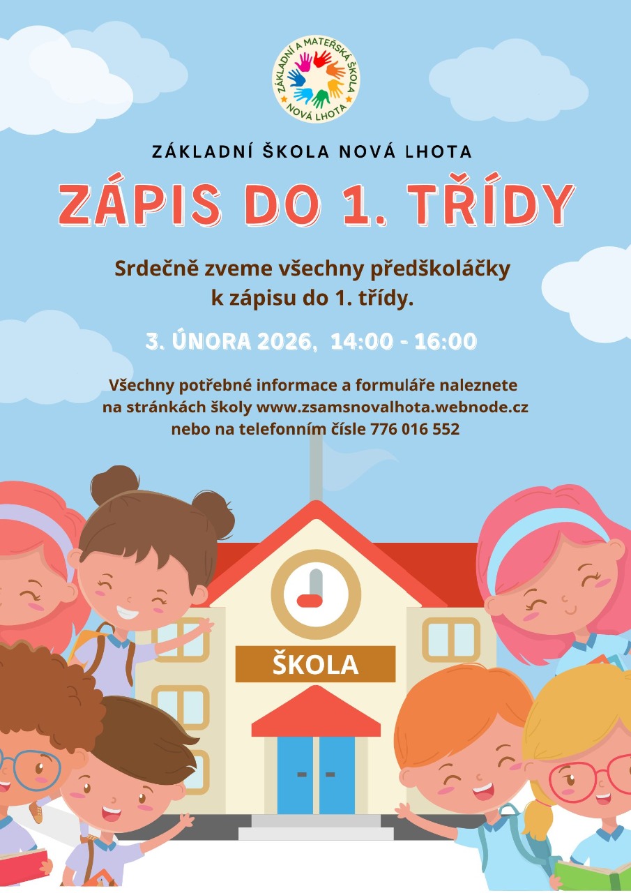 Zápis do 1. třídy ZŠ proběhne 3. 2. 2026 v době od 14:00 do 16:00 hodin. Náhradní termín je stanoven na 4. 2. 2026 nebo dle telefonické domluvy i jindy.